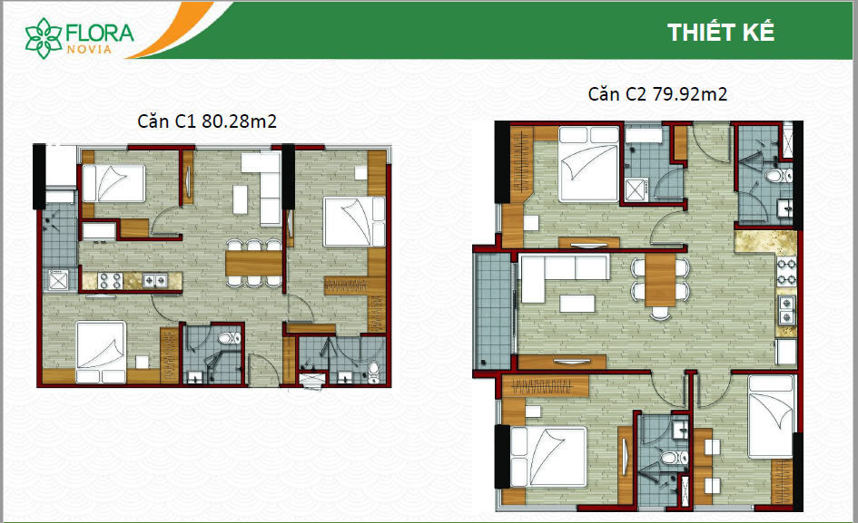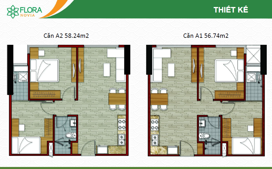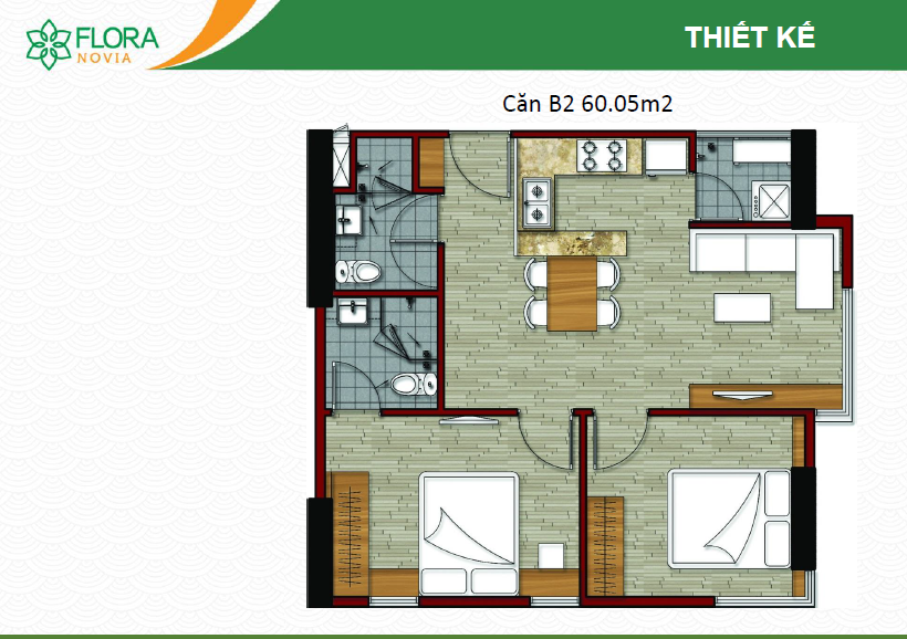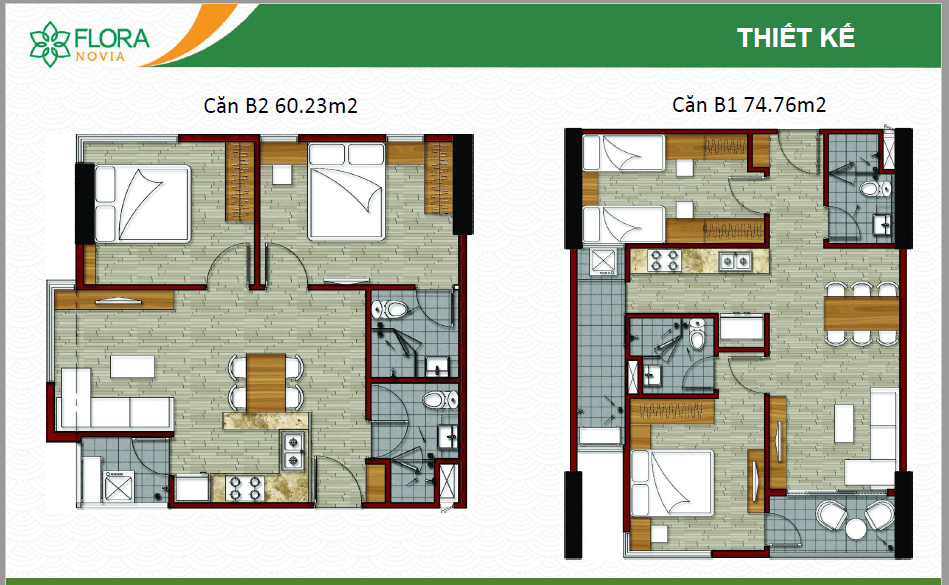Thiết kế mỗi căn hộ Flora Novia đều có hai đến 3 mặt thoáng. Sàn gỗ cao cấp, bếp được hoàn thiện ( có bếp từ tích hợp hồng ngoại theo tiêu chuẩn quốc tế ).
