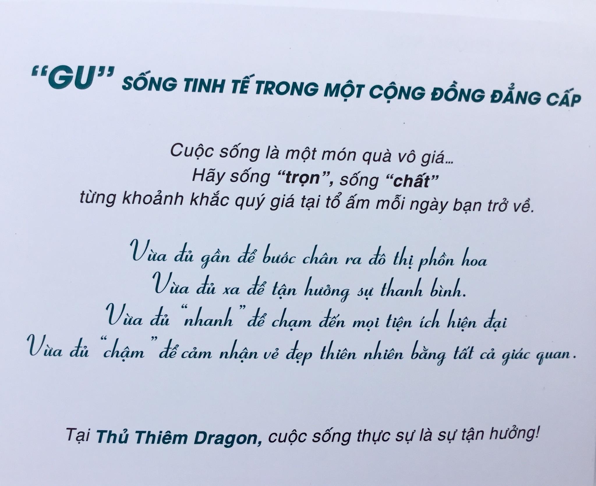 – Bước chân vào cánh cổng Thủ Thiêm Dragon, một thế giới bình yên, biệt lập chào đón bạn với những tiện ích đẳng cấp 5 sao “không dành cho số đông“. Hãy khám phá những xúc cảm tuyệt vời khi không gian sống hòa quyện vào thiên nhiên tuyệt đối.