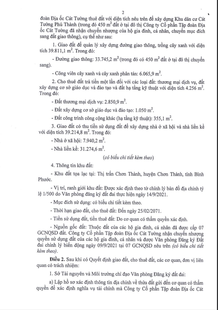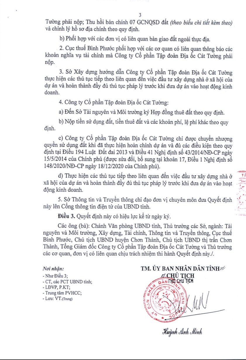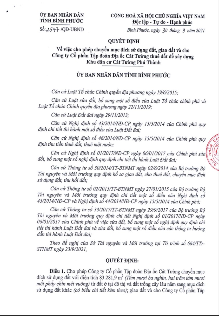 Ngày 30/09/2021, UBND tỉnh Bình Phước kí quyết định SỐ 2547/QĐ-UBND về việc chuyển đổi mục đích sử dụng đất, giao đất cho Công ty CP Tập đoàn địa ốc Cát Tường để tiến hành triển khai dự án.
