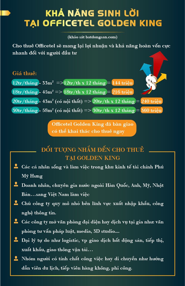 Vươn mình giữa Khu đô thị Phú Mỹ Hưng (Q.7, TP.HCM), Golden King là khu phức hợp cao cấp bao gồm trung tâm thương mại chuẩn quốc tế và các tầng căn hộ kết hợp văn phòng officetel. Nổi bật với phong cách kiến trúc sang trọng, hiện đại, Golden King hội tụ hài hòa những tinh hoa thời đại, mang đến một không gian đẳng cấp, tôn tạo giá trị sống đỉnh cao cho chủ nhân.