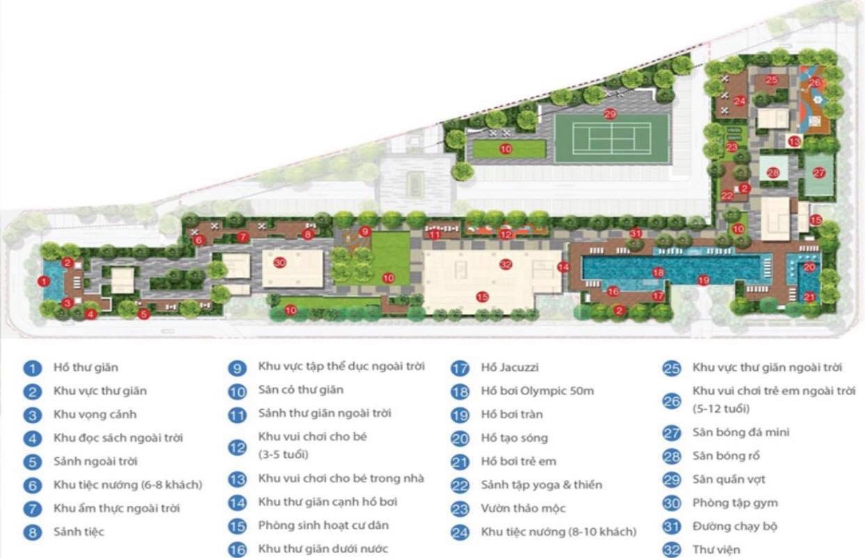 - Tầng 3 tiện ích: sân bóng rổ, hồ bơi người lớn, trẻ em, hồ jacuzzi, vườn thư giãn