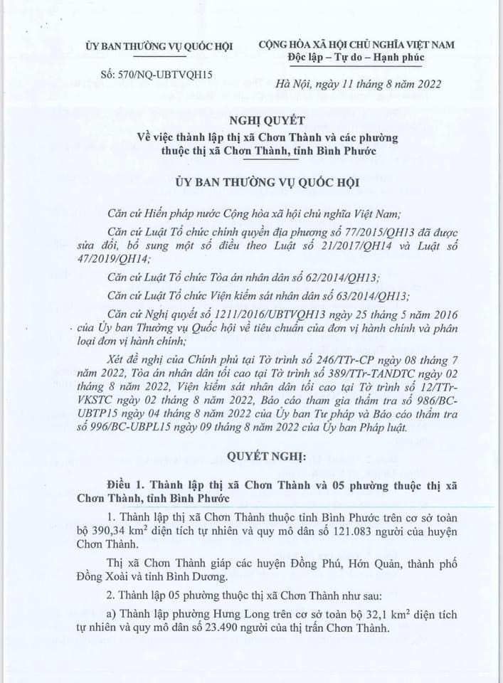 Điều 1. Thành lập Thị xã Chơn Thành và 05 phường thuộc Thị xã Chơn Thành, tỉnh Bình Phước.